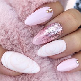 Simply apply just as you would do a plain tip using either clear acrylic or clear gel. Place glitter or rhinestones at the base of your nails and fade into sheer coloror flip it and fade your color into glitter-covered tips. The pink is gorgeous The marble design came out so pretty.