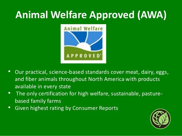 The Animal Welfare Act requires researchers to provide anesthesia or pain-relieving medication to minimize the pain or distress caused by an experiment unless otherwise scientifically justified. 43 22 Acknowledgement of regulations and standards. AWA audits certifies and supports independent family farmers raising their animals according to the highest animal welfare standards outdoors on pasture or range.